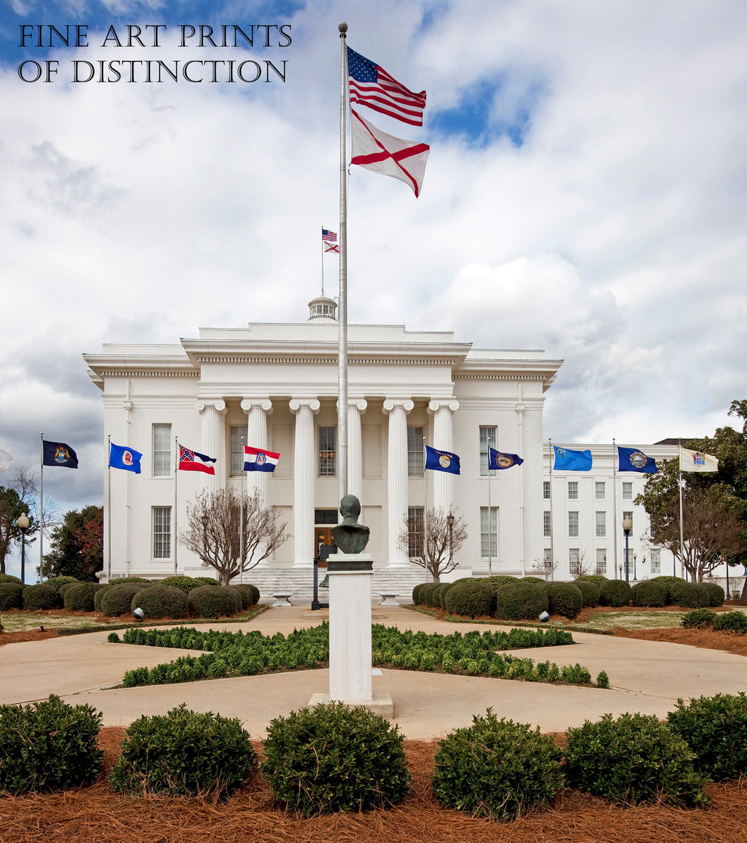 An art Print of the Avenue of Flags at the south entrance of the State Capitol Building at Montgomery Alabama for sale by Brandywine General Store. The Avenue of flags features a state flag from each of the fifty states in the Union along with a native rock at the bottom of each flag pole. The Avenue of Flags at the Alabama State Capitol building was dedicated in 1968. Picture #162
