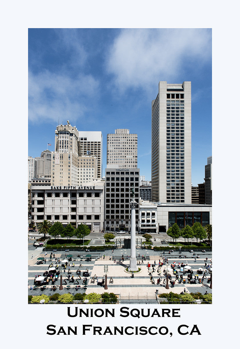 An Art Print of Union Square at San Francisco California for sale by Brandywine General Store. This scenic composition shows the large buildings that house Saks Fifth Avenue and Tiffany's. The name of Union Square derives from the Pro Union rallies that were held here at the beginning of the Civil War. The monument is a tribute to the sailors of the US Navy. Union Square was built and dedicated by San Francisco's first American mayor, John Geary in 1850. The 2.6 acre public plaza today is filled with department stores, upscale boutiques, gift shops, art galleries and beauty salons and is among one of the most visited shopping areas in the United States. Grand Hotels, plays, theaters also contribute to the aura of Union Square. Picture #80