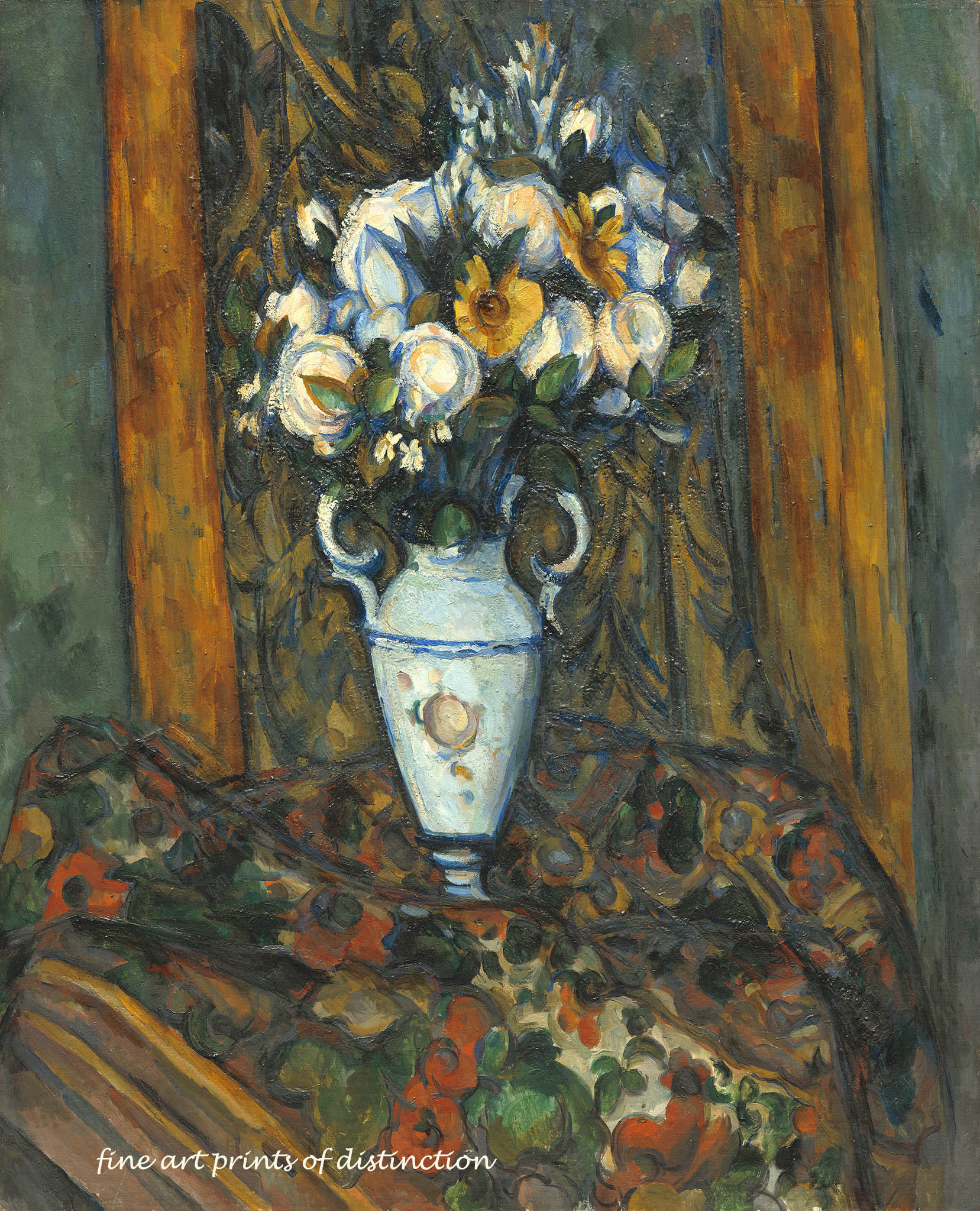 An archival art Print of Vase of Flowers painted by French Impressionist artist Paul Cezanne in 1903 for sale at Brandywine General Store. Our premium quality artwork shows a still life oil on canvas that has a blue painted vase full of flowers that are mostly blue and yellow in color. The vase is setting in a high backed chair with a richly colored textile draping over the chair. Famous Artists print #310