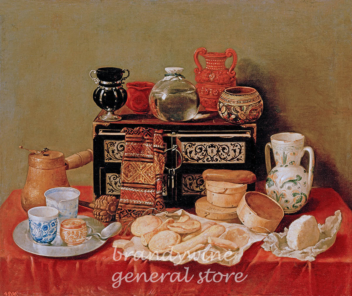 An archival art print of Still Life with Ebony Chest painted by Spanish artist Antonio de Perada in 1652. The oil on canvas features all the accouterments needed to serve chocolates to drink. Chocolate was all the rage in 17th century Spain as this was a new import from the Spanish colony of Mexico in the new World. Famous artists print #351, a premium quality artwork offered by Brandywine General Store.