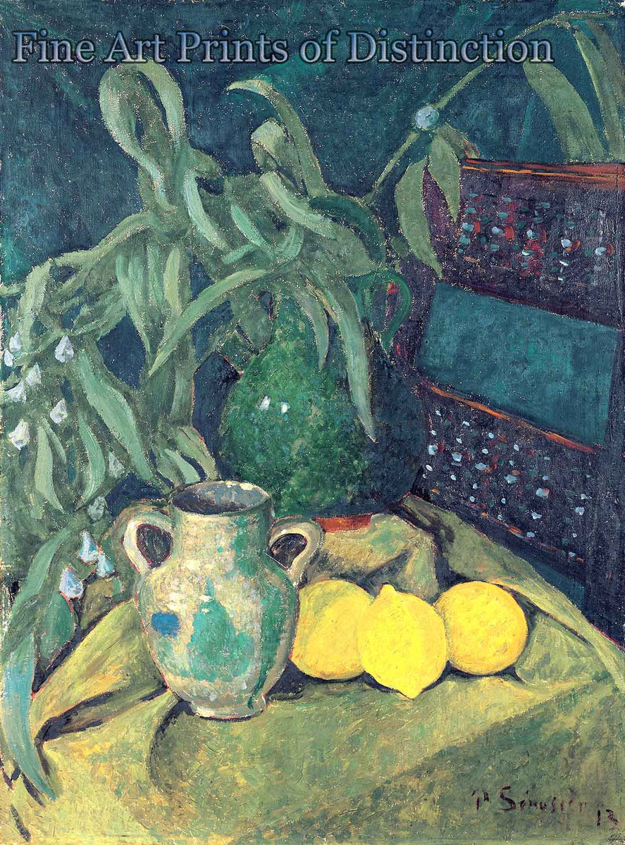 An archival premium Quality art Print of A Synchrony in Green by Paul Serusier for sale by Brandywine General Store. This simple still life by the French Artist shows a table top covered with a green tablecloth. On the table is a large vase with long slender green stalks with small blue blooms. Another smaller vase with two handles are also on the table along with 3 ripe yellow lemons. Please be aware the paint is thin in places and shows through somewhat in the final print. Still Life print #15