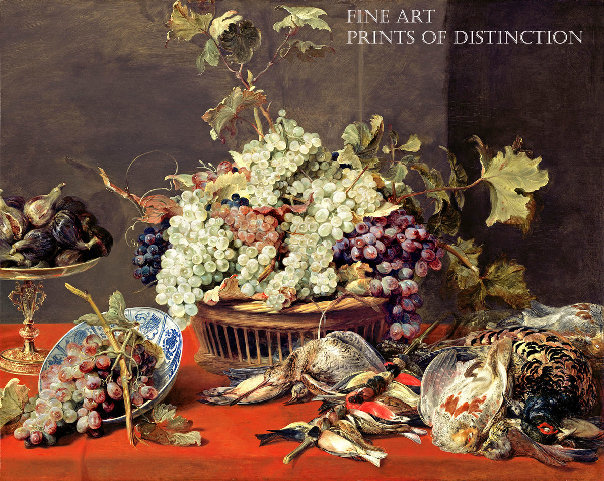 An archival premium Quality art Print of Still Life with Grapes and Game painted by Flemish artist Frans Snyders in 1630 for sale by Brandywine General Store. In the early 17th century, Frans Snyders created a new form of still life by combining fruit and game into a single image, and Still Life with Grapes and Game is an outstanding example of this innovation. Snyders's lavish still lifes—wittily arranged and executed with his broad, firm brushstrokes and characteristic palette of bright and direct colors—have a dynamic character unmatched by other artists. The focus of this remarkably well-preserved panel painting is an enormous wicker basket filled with red and green grapes in the center of a table covered by a red tablecloth. A couple of grape vines, their withering leaves still attached, add complexity to the arrangement. A tazza filled with luscious black figs, a Wan-Li bowl with red grapes, and dead game birds —including a brace of partridge, a splendid male pheasant, and a woodcock—surround the central basket. A row of finches, clamped between the two halves of a stick that juts out over the table's edge, adds to the colorful mix. The fruit and game birds fill the picture space and even appear to extend beyond its limits, a device Snyders often used to indicate spatial extension beyond the confines of the picture itself, thereby enhancing the viewer's sense of immediacy. Old Masters art print #97