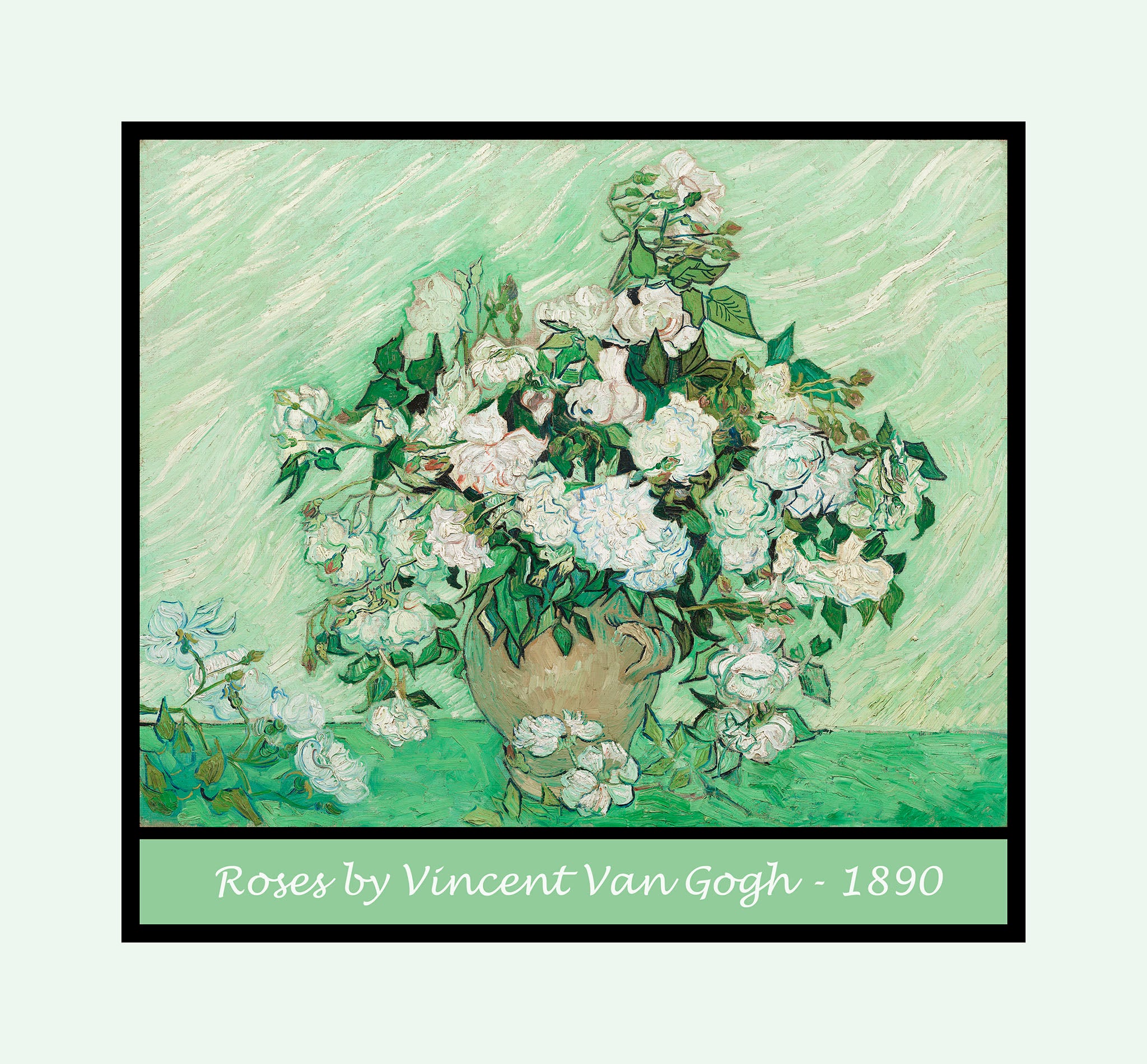 An archival art Poster of Roses painted by Vincent Van Gogh in 1890 for sale by Brandywine General Store. Our premium quality artwork shows a bouquet of white roses against a spring green background. These flowers were originally pink, but the original canvas has faded the pink into white. This bouquet was painted by Van Gogh while at the St. Remy mental institution. Our posters are the same premium quality as our fine art prints. Famous artists print #318a