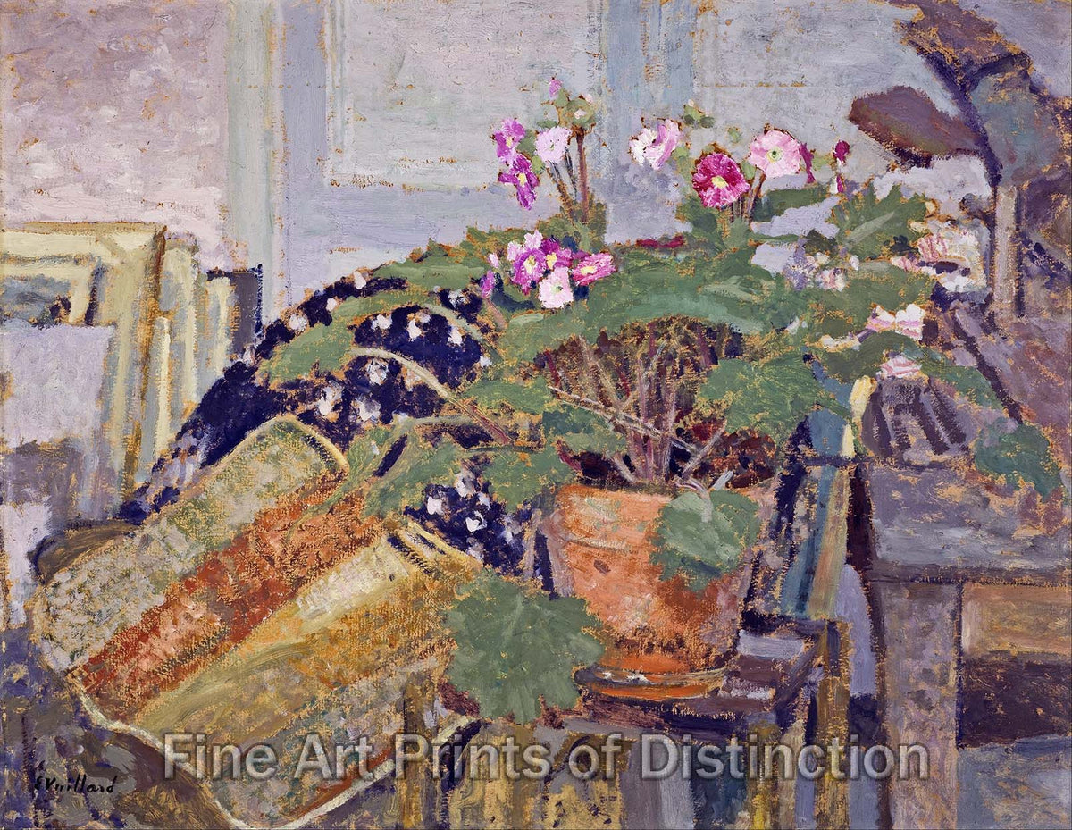 A premium Quality art Print of Pot of Flowers by Edouard Vuillard or better known in French as Le Pot de Fleurs. The original oil on mill board which measures 19 by 24 inches was completed in 1900 and now hangs in the National Gallery of Scotland. The artist selected much of his material from the small Paris apartment, which he shared with his Mother. In painting common and familiar subjects he would often choose unusual angles and compositions to set his paintings apart with a distinctive look. Like many of his still life paintings, this one has a casual appearance rather than a staged or posed arrangement of objects set up specifically for drawing. The stack of canvases on the left confirm this is a view of the artist's studio, while the pot of flowers look they are violets with blankets to the left and a desk of some kind on the right side. Famous artists print #86 an archival art print from Brandywine General Store.