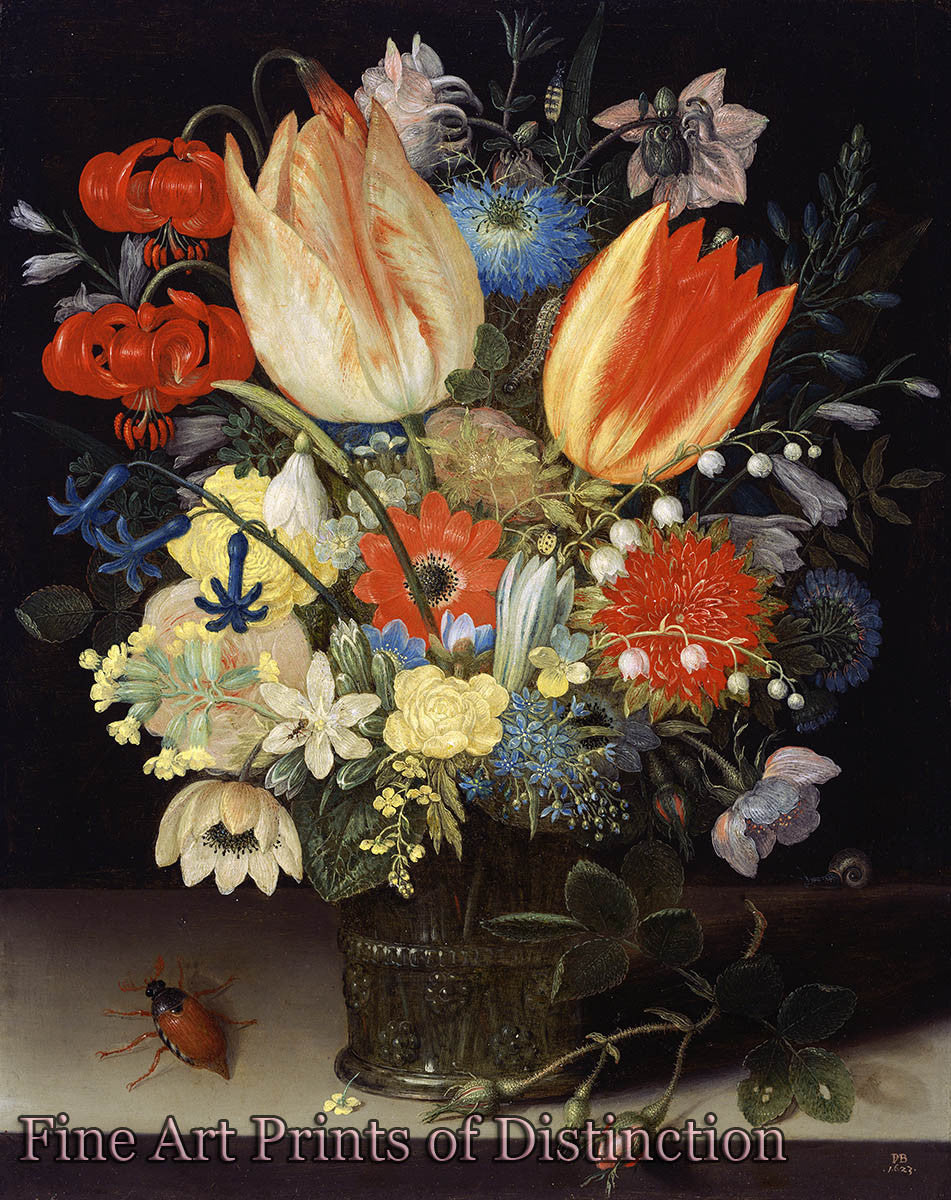 An archival premium quality art Print of Still Life with Tulips by Peter Binoit for sale by Brandywine General Store. This very colorful oil on copper painting was completed by the German artist in the year 1623. As the name suggests, two large striped tulips form the center piece of this flower arrangement. Adding a myriad of other colors are tiger lilies, asters, lily of the valley, carnations, star hyacinths, roses bloom and buds laying on the table and many more flowers of different sizes and colors. A lady bug is laying on the table beside the green flower pot. Still Life Painting #20