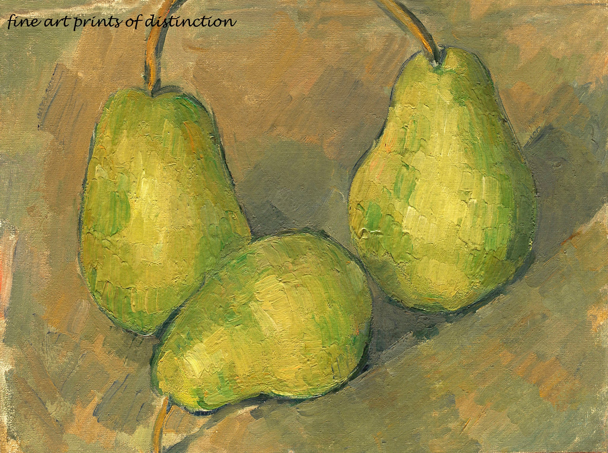 An archival art Print of Three Pears painted by French Impressionist Paul Cezanne in 1879 for sale by Brandywine General Store. Our premium artwork shows a still life painting by the French Impressionist artist Cezanne with a simple subject of 3 green pears against a brownish green background. Each pear still has the stem at the top. Famous Artists print #313
