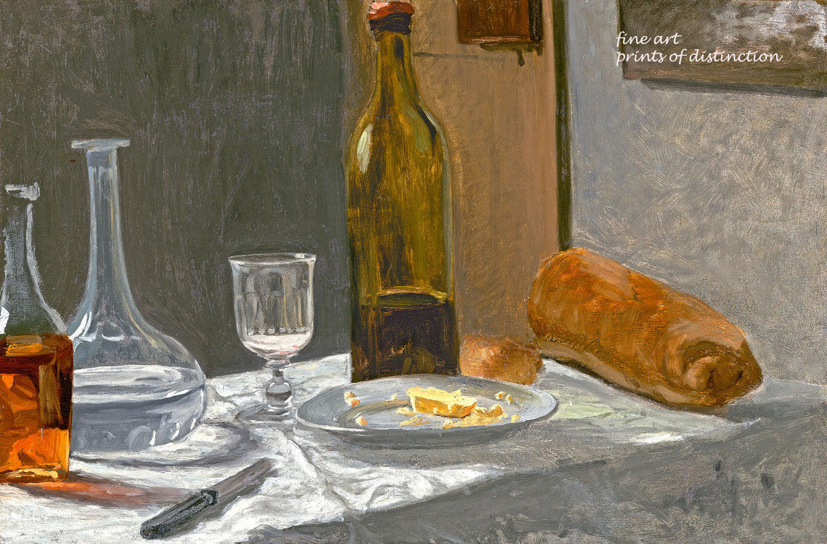 An archival premium Quality art Print of Still Life with Bottle, Carafe, Bread and Wine painted by Claude Monet in 1863 for sale by Brandywine General Store. Our artwork shows this still life setting on a white table cloth and includes a carafe of tea, bottle of water, a wine glass, a half full wine bottle, plate of cheese, a loaf of bread with the end cut off and a knife. Everything needed for a small afternoon snack. Famous artists print #326