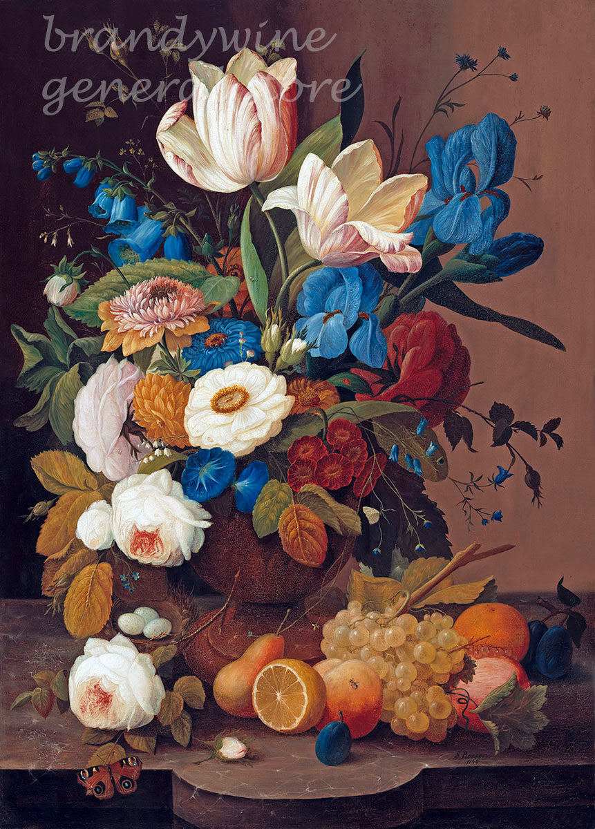Immerse yourself in the splendid world of Severin Roesen's "Still Life Flowers and Fruits," a magnificent 1848 creation by this talented German artist. This stunning print showcases an overflowing garden of blooms—irises, tulips, cabbage roses, bluebells, and dahlias—artfully combined with fresh fruits including apples, oranges, and more. Roesen's extraordinary ability to capture the delicate beauty and vibrant colors of each flower and fruit creates a sense of abundance and natural wonder. Every detail invites closer inspection, revealing the artist's dedication to his craft. Whether you're drawn to classical floral art, botanical beauty, or simply appreciate masterful painting, this print brings timeless elegance and the joy of nature's generosity into your home. Famous Artists picture #353 a premium quality still life artwork offered by Brandywine General Store.
