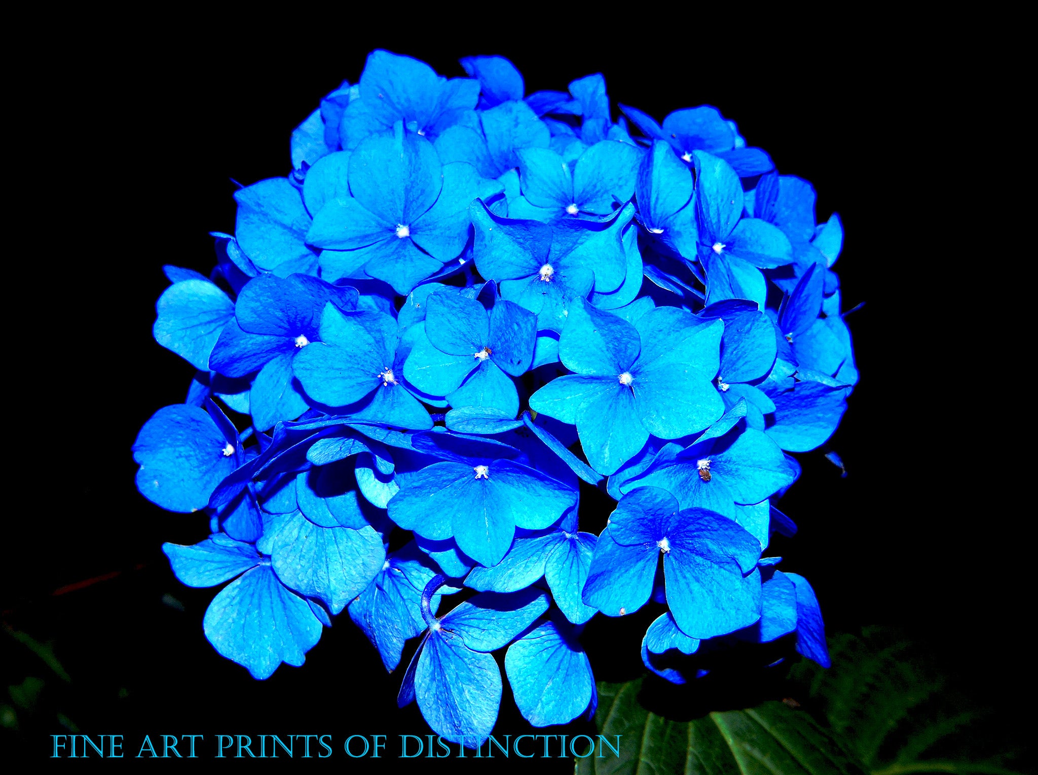 An archival premium Quality Print of a Hydrangea with Large Blue Bloom for sale by Brandywine General Store. Our botanical artwork features nothing but blue blooms against a black background with a few leaves showing at the bottom. To get a rich bright blue such as this, the hydrangea must be grown in acidic soil with a ph of 5.5 and lower. Anything more alkaline will add purple and then pink to the blooms depending on the ph level. Picture #160