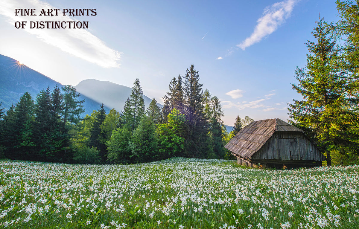 An Art Print of a Landscape with Old Shed and White Narcissus Flowers for sale by Brandywine General Store. Our scenic artwork shows a wooden shed with an unusual roof surrounded by a field of white narcissus flowers. In the background are tall trees and some mountain peaks. Narcissus flowers are members of the daffodil family and will naturalize over big areas such as this in several years if left alone. Picture #184 a premium quality scenic landscape print