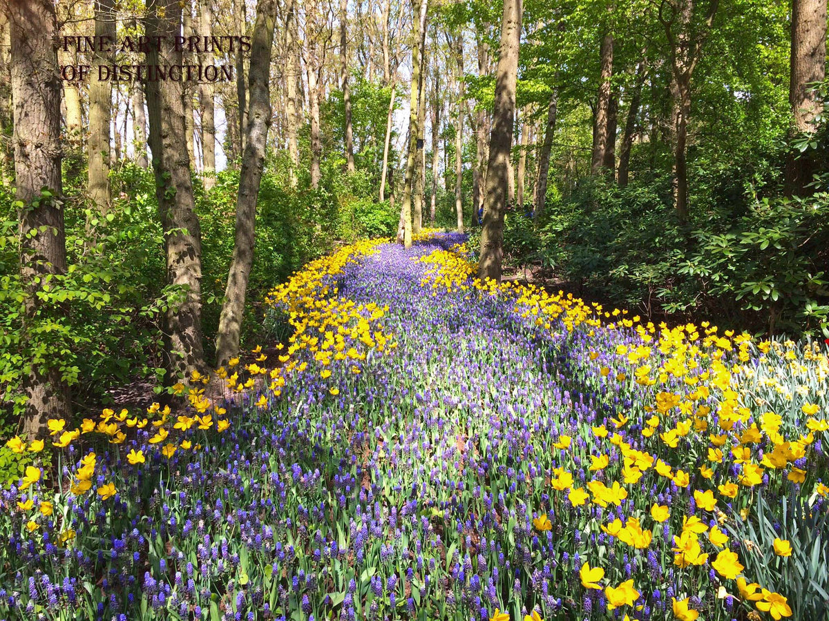 An art Print of a Wooded Landscape with Yellow Tulips and Grape Hyacinths for sale by Brandywine General Store. Our nature artwork shows an unusual scene with this many colorful flowers in the deep woods. It almost looks as if there was a road at one time and the property owner wanted to close the road. They planted the center with purple grape hyacinths and one each side of those are a border of yellow tulips. Picture #183