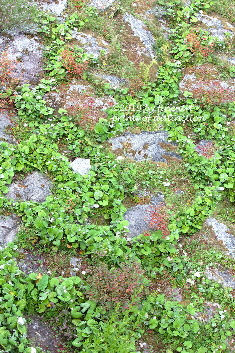 An Art Print of Green Plants and Flowers Snaking Through the Rocks sold by Brandywine General Store. Our artwork shows green plants, small white Queen Anne's Lace and small red fall leaves on shrubs which add some color. All of these are growing in paths around the rocks. This photographic scene was taken at the very top of Spruce Knob Mountain in the rugged Allegheny mountains range of West Virginia. Picture #652 an original premium quality nature print made from a photograph in the Brandywine collection.
