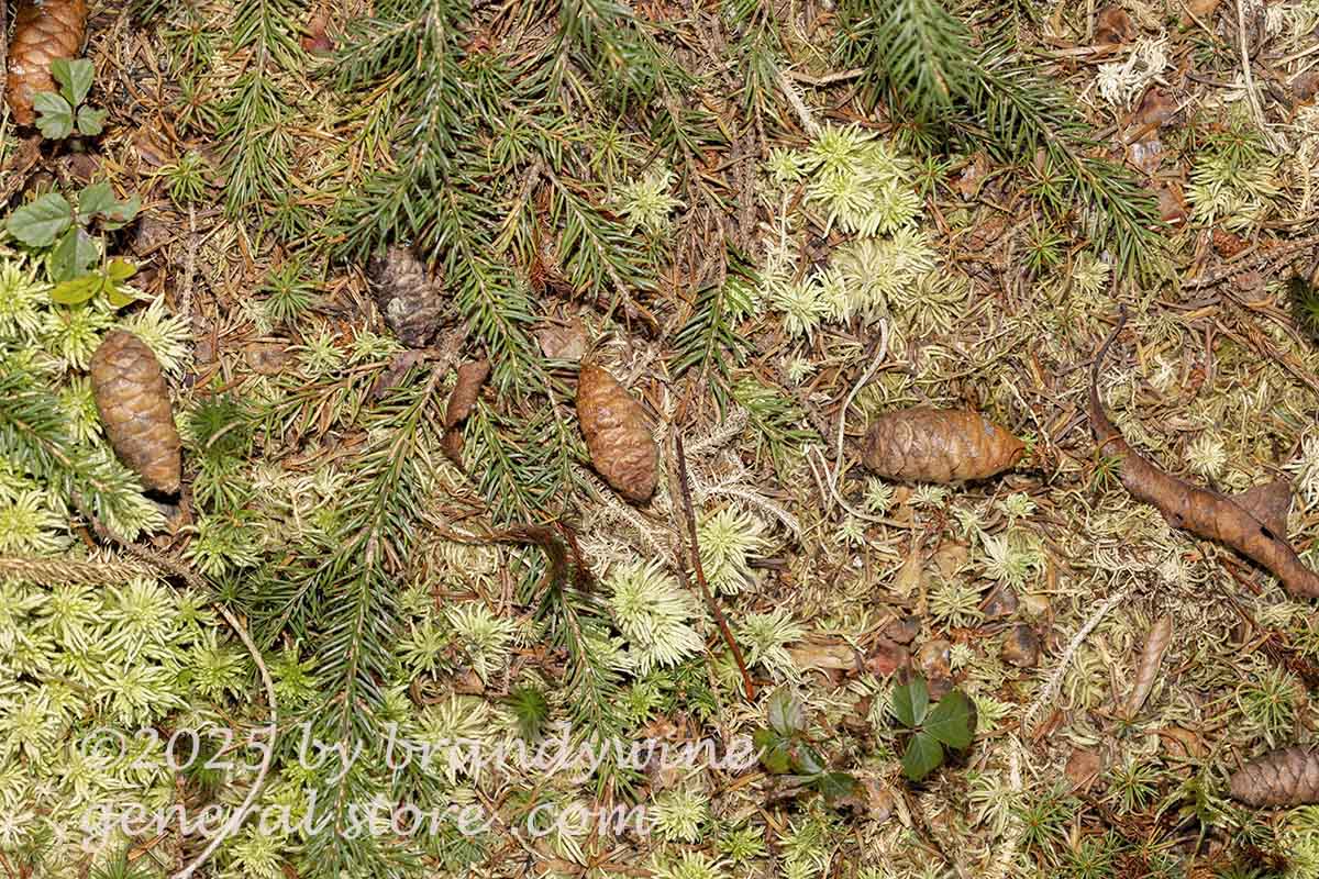 An art print of Pine Cones on forest floor with moss and dried leaves by Brandywine General Store. Our nature artwork features a macro landscape of four small pine cones lying among dried leaves, pale green mosses and some spruce branches. The scene is along the dge of Spruce Knob lake in West Virginia. Picture #1826 an original premium quality nature artwork made from a photograph in the Brandywine collection.