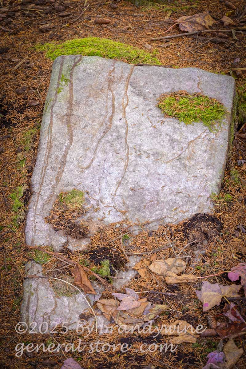 An art print of Tombstone rock on Spruce Knob mountain by Brandywine General Store. Our nature artwork features a flat rectangular rock which is in the shape of a headstone that is partially buried in the dried leaves and moss. This is not a tombstone but has the shape the early settlers would have admired for that purpose. Picture #1822 an original premium quality nature print made from a photograph in the Brandywine Collection.