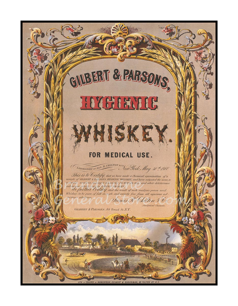 An archival premium quality art print of Gilbert and Parsons Hygienic Whiskey for sale by Brandywine General Store. Our artwork features an 1860 advertisement stating that the hygienic whiskey was only for medical use. The lithograph has a large statement in the center from a laboratory stating the hygienic whiskey was pure, full strength and free from all injurious ad mixtures. The parchment in the center is surrounded by a floral border with a village scene at the bottom. Picture #232 a premium quality antique ad print made from a 19th century litho.