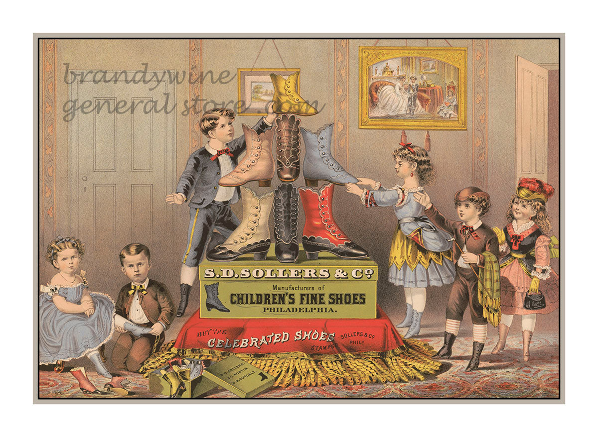 Archival art print of an antique advertisement for Sollers Children's Fine Shoes featuring 6 children, dressed in fine 19th century clothing, admiring a stack of high top shoes. On the base of the shoe tree is printed S. D. Sollers and Co. Manufacturers of Children's fine shoes - Philadelphia. Buy the celebrated shoes stamped Sollers and Co. Phila. Picture #254 a premium quality art print made from an antique ad being offered by Brandywine General Store.