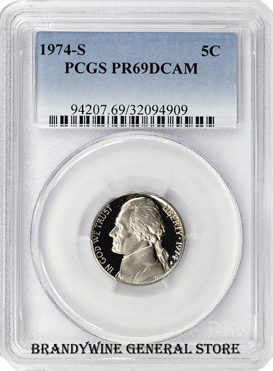 1974-S Jefferson Nickel certified Proof 69 Deep Cameo by PCGS. The coin is of course silver in color, the glossy, shiny surface of US mint modern proofs, while among the most beautiful of the coins, reflect the light and make the nickels appear black or brownish instead of their natural silver color when photographed. You can rest assured that the coin you purchase from us will look great, it has to since it is in a PCGS 69 DCAM holder. We have more than one 1974 S Jefferson Nickel PR69DCAM available for sale at Brandywine General Store, so you might receive a different PCGS Certification number.