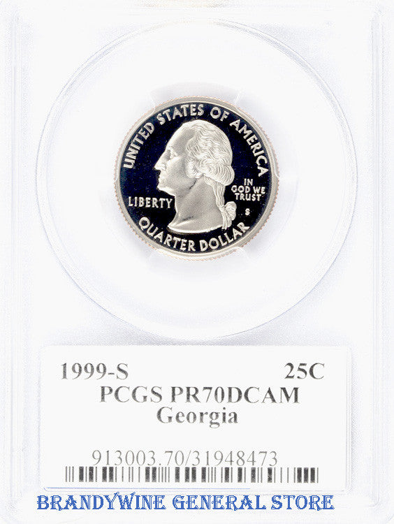 A 1999-S Georgia Statehood Quarter certified by PCGS at Proof 70 Deep Cameo, making this a coin in perfect condition. Georgia became the 4th state to join the early United States in 1788 and was one of the original colonies. The design on their quarter features the ever famous Georgia Peach inside the state outline. Oak leaves surround this design with the motto "Wisdom, Justice, Moderation". Our coins look much better than the photo suggests, any scratches or blemishes you see are on the plastic slab and not the coin itself, please keep in mind our images are magnified around 10 times, so this makes the least fault look much worse than it actually is. Also this coin is of course, silver in color, but modern proofs, even though among the most beautiful of the coins, with their glossy surfaces reflect all of the light giving them the black color when photographed. Rest assured that the coin you purchase will look great, it has to since it is in a PCGS 70 holder. Brandywine General Store has more than one 1999-S certified PCGS PR70DCAM Georgia Statehood quarters available for sale, so you might receive a different PCGS certification number. This coin will make an excellent addition to a PCGS registry set.