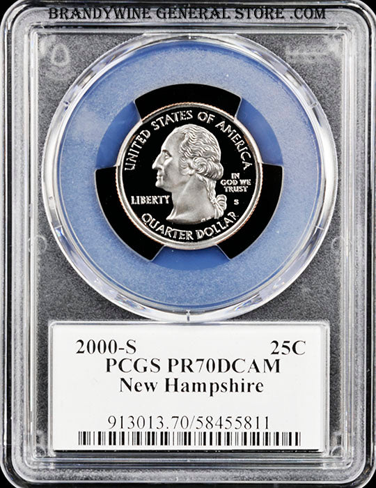 A 2000-S New Hampshire Statehood Quarter that has been certified as perfect by PCGS at Proof 70 Deep Cameo. The coin features the iconic Old Man in the Mountain rock formation along with the state motto Liver Free or Die. New Hampshire was one of the original 13 colonies becoming a state in 1788. This coin is of course, silver in color, but modern proofs, even though among the most beautiful of the coins, with their glossy surfaces reflect all of the light giving them the black or brownish color when photographed. Rest assured that the coin you purchase will look great, it has to since it is in a PCGS 70 DCAM holder, which is the highest grade awarded by PCGS. Brandywine General Store has more than one 2000-S New Hampshire statehood quarter certified by PCGS at Proof 70 Deep Cameo available for sale, so you might receive a different PCGS certification number.