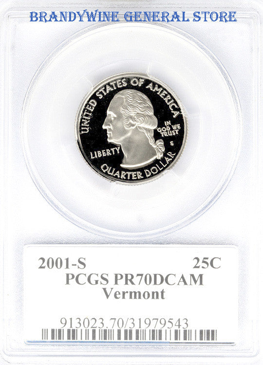 A 2001-S Vermont Statehood Quarter that has been certified by PCGS at Proof 70 Deep Cameo. Vermont became the 14th state in 1791 becoming the first state admitted to the newly formed Union after the first 13 colonies broke away from England. The design on their quarter features sugar making, before the advent of cane sugar, the colonies depended greatly on Vermont for its sugar and syrups. In the background is Camel's Hump mountain, one of the highest peaks in the state, which also portrays the importance of the ski industry to the state. This coin is of course, silver in color, but modern proofs, even though among the most beautiful of the coins, with their glossy surfaces reflect all of the light giving them the black color when photographed. Rest assured that the coin you purchase will look great, it has to since it is in a PCGS 70 holder. Brandywine General Store has more than one 2001-S certified PCGS PR70DCAM Vermont Statehood quarters available for sale, so you might receive a different PCGS certification number.
