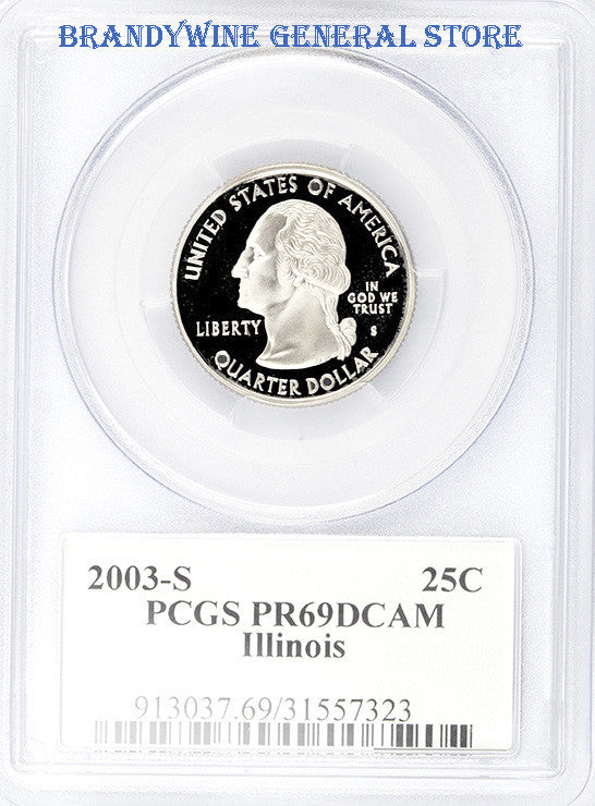 A 2003-S Illinois Statehood Quarter that has been certified by PCGS at Proof 69 Deep Cameo. Our coins look much better than the photo suggests, any scratches or blemishes you see are on the plastic slab and not the coin itself, please keep in mind our images are magnified around 10 times, so this makes the least fault look much worse than it actually is. Also this coin is of course, silver in color, but modern proofs, even though among the most beautiful of the coins, reflect all of the light giving them the black color when photographed. We have more than one 2003-S IL Statehood quarters available for sale, so you might receive a different PCGS certification number.
