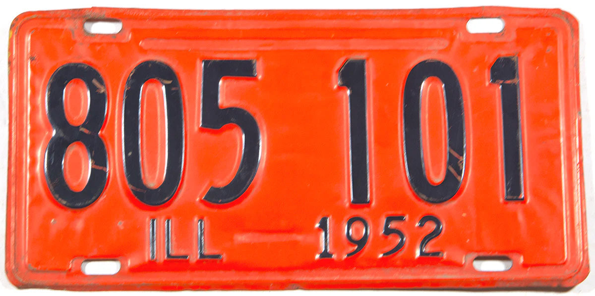 Antique single 1952 Illinois passenger car license plate for sale by Brandywine General Store. The 52 IL DMV Automobile Tag is orange with black letters. On the bottom is the state abbreviation ILL and the year 1952. We have more than one 1952 Illinois single car license plate available, for sale but have included a picture of each tag currently in our inventory.