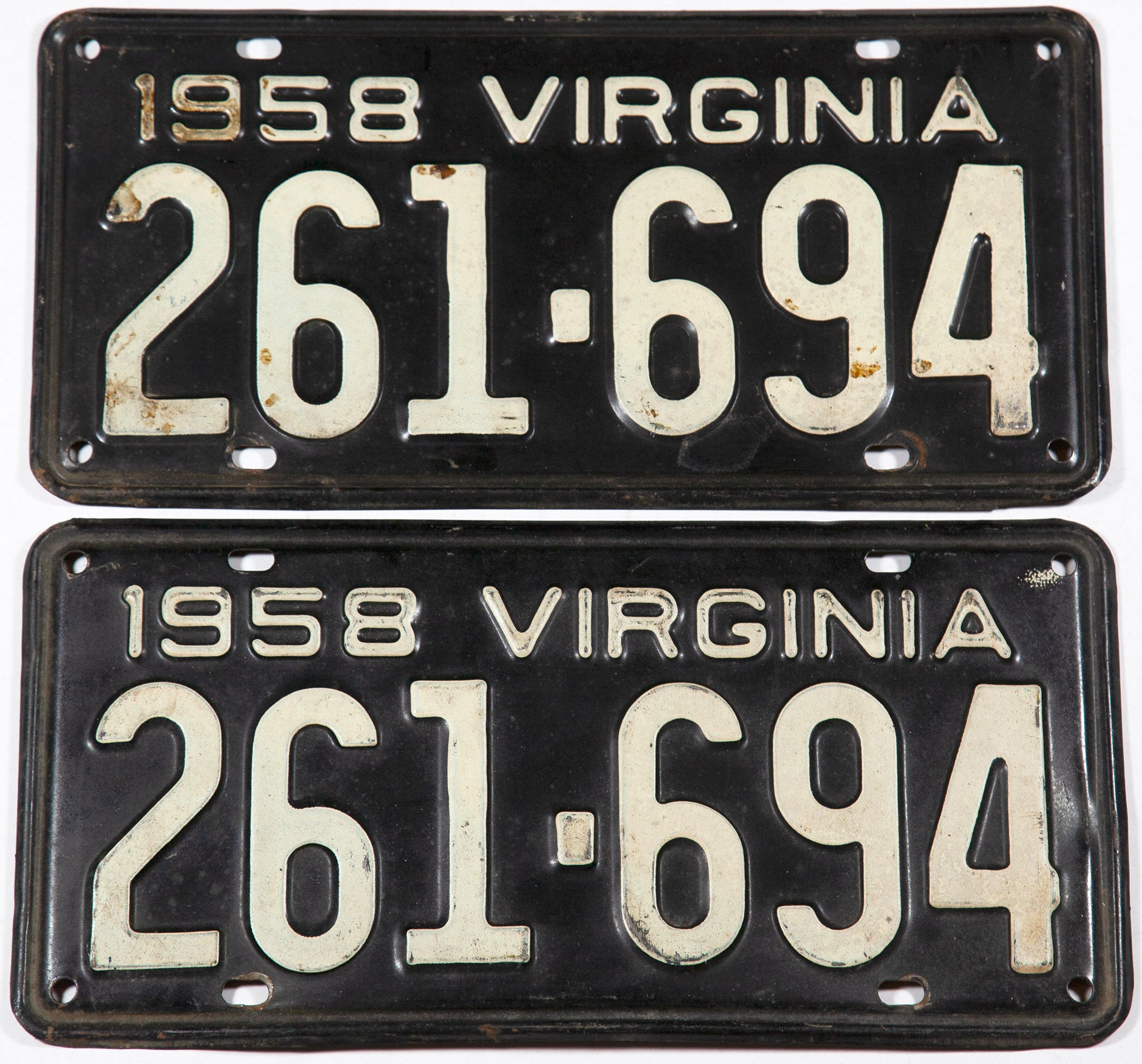 Pairs and Single Tags of 1958 Virginia passenger car license plates available for sale by Brandywine General Store. The '58 VA DMV automobile tags are black with white letters, 1958 Virginia are both at the top. The department of motor vehicles registration number will vary as we have more than one set or single available for sale at Brandywine General Store, however we have included a picture of each currently in our inventory.