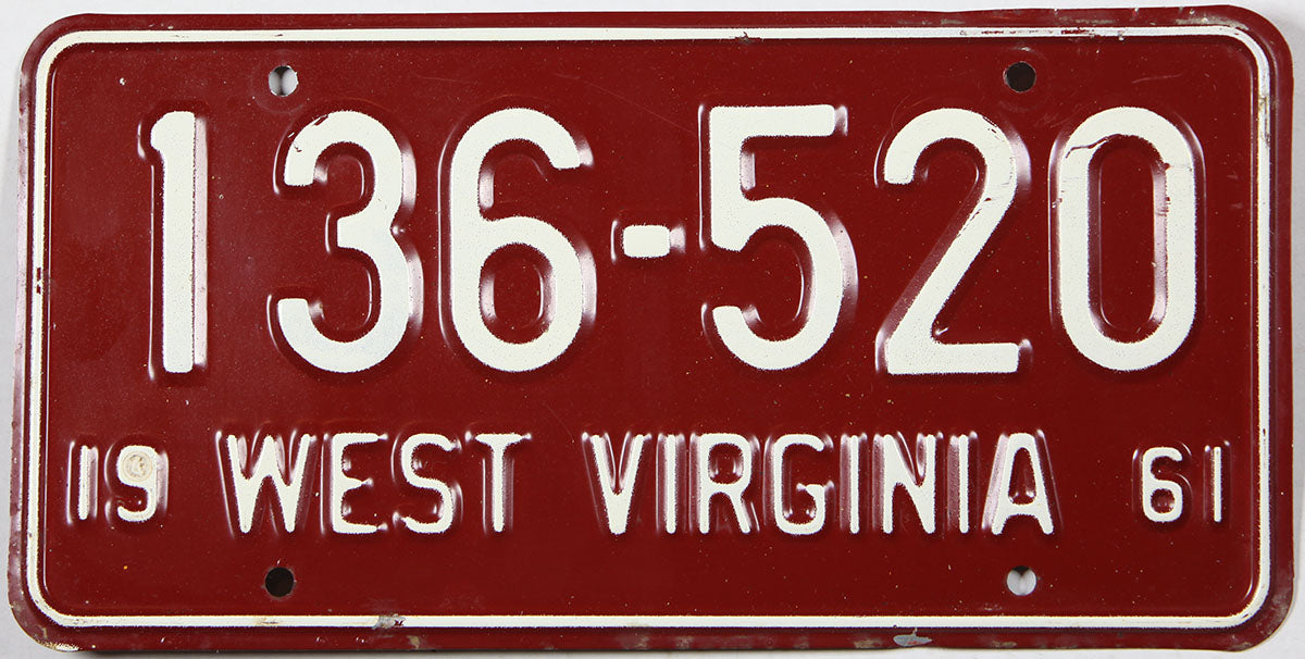 Classic 1961 West Virginia Aluminum car License Plate for sale by Brandywine General Store. The 61 WV DMV auto tag has the expiration date on the bottom; the color is maroon with white. The DMV only issued single tags for the state's motorists to use on their vehicles during the model year of 1961. For some reason the Mountain State Department of Motor Vehicles made several different varieties of license plates during 61. Some were made out of aluminum such as these, some were steel. Some of the tags were embossed, some debossed, some had a reflective coating and some did not. We have more than one 1961 West Virginia Aluminum car license plates available for sale in our store, we have included a picture of each tag we currently have in stock.