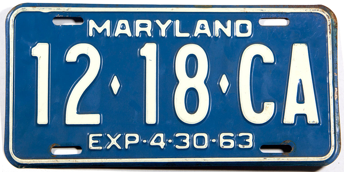 A classic 1963 Maryland Ambulance License Plate for sale at Brandywine General Store. The 63 MD ambulance tag is blue with white letters, the DMV expiration date is at the bottom. The Department of Motor Vehicles registration number is 12-18-CA, the condition is very good. The picture shows the actual 1963 Maryland Ambulance license plate that is for sale.