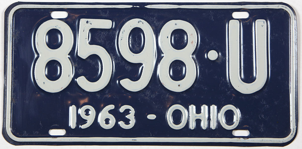 Classic 1963 Ohio Car single License Plate for sale by Brandywine General Store. The 63 OH DMV auto tag is cobalt blue with white, the expiration date is on the bottom. The department of motor vehicles registration number will vary as we have more than one vintage 1963 Ohio license plate available for sale, but we have included a picture of each one currently in our inventory. Our single plates make great additions to collections, for decorating purposes or state or birth year runs.