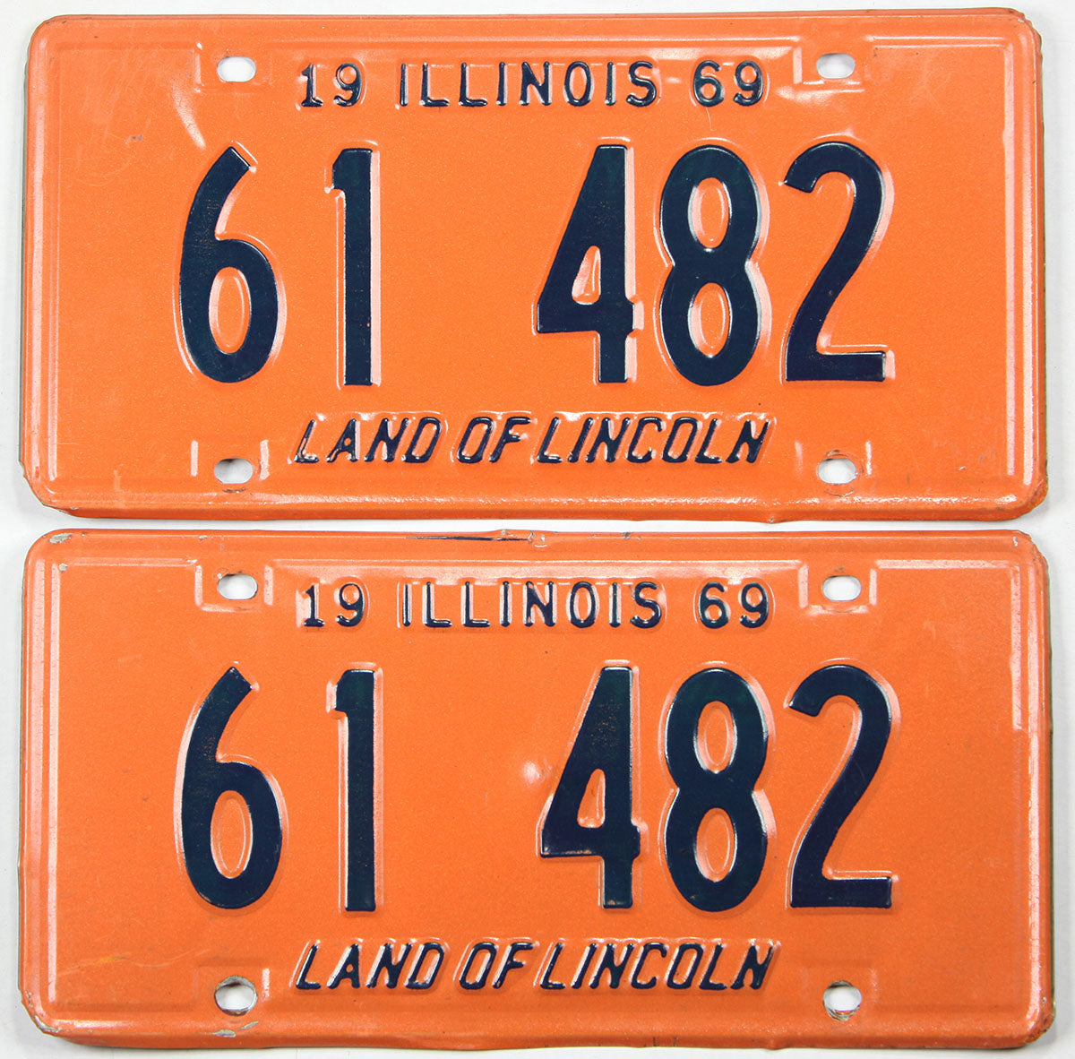 A Pair of classic 1969 Illinois Car License Plates for sale at Brandywine General Store. The 69 IL DMV automobile tags are burnt orange with black, the expiration date at the top and Land of Lincoln is at the bottom. The 1969 IL automobile tags may be suitable for YOM registration but first check with the IL DMV to see if they allow the use of antique plates for year of manufacture registration and if so will these qualify. We have more than one pair of classic 1969 Illinois car license plates available for sale, but we have included a picture and listing for each set currently in our inventory.
