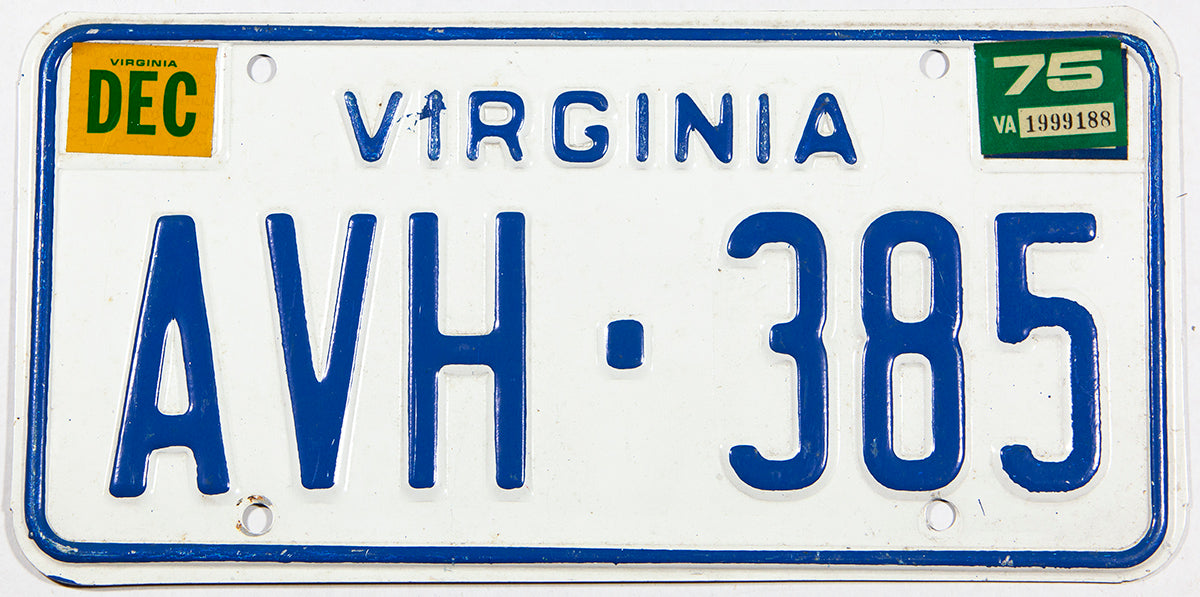 A 1975 Virginia passenger car license plate for sale at Brandywine General Store, the color of this '75 VA DMV automobile tag is white with blue. Virginia and the DMV expiration stickers are at the top. The VA department of motor vehicles issued two plates in the 1975 model year for the state's motorists to use on their cars, but this sale is for 1 tag only, great for an automobilia collection from the Old Dominion or a birth year run. The DMV registration number will vary as we have more than one 1975 Virginia car license plates available for sale, but we have included a picture of each tag currently in our inventory.