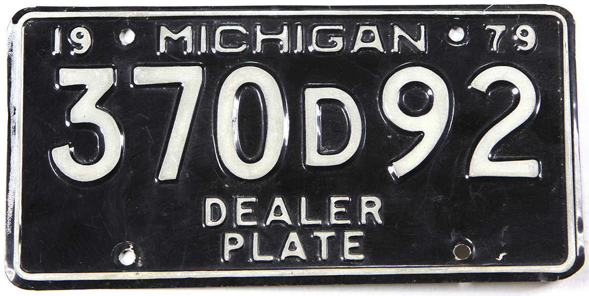 A 1979 Michigan dealer license plate for sale by Brandywine General Store. The 79 MI DMV dealer tag is black with white, the expiration date is at the top. The department of motor vehicles registration number will vary as we have more than one 79 Michigan dealer plate available for sale, but we have provided a picture of each tag currently in our inventory.