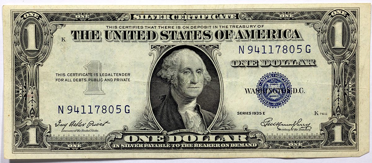 A Fr #1614 series of 1935-E silver certificates in the denomination of one dollar for sale by Brandywine General Store. Our raw banknotes in the lower grades are great for a young starting currency collector. The designation of this US paper money is Friedberg 1614 and is signed by Priest and Humphrey. We have more than one 1935 E one dollar silver certificates available for sale and in different conditions but we have included a representative picture of a bill from each category.