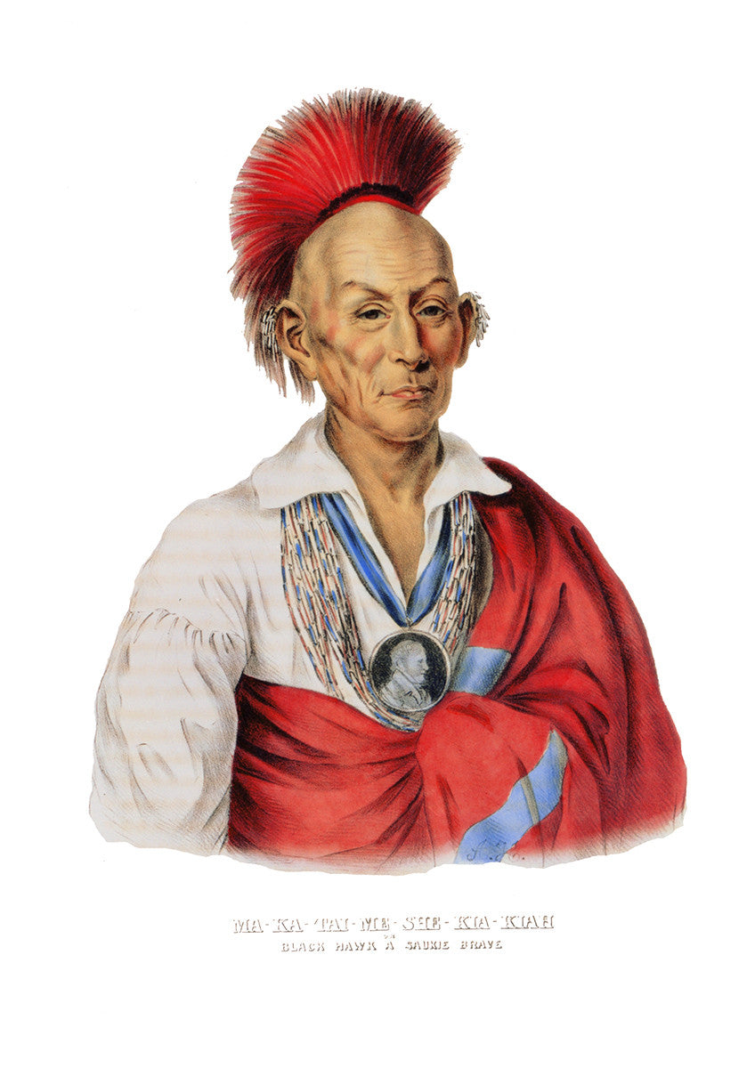 An archival premium Quality Art Print of Black Hawk a Sauk Warrior Native American Portrait for sale by Brandywine General Store. Ma-ka-tai-me-she-kia-kiak or Black Sparrow Hawk was born around 1767 at Saukenuk which was the principal Sauk city located along the Rock River. He was born into the Thunder Clan a son of Py-e-sa, a member of the warrior class. Black Hawk was 15 years old when he wounded his first enemy in battle, this deed earned him the right to paint his face and wear feathers, after awhile, due to his prowess on the battle field, he came to be a trusted leader of large war parties. During the War of 1812 he fought on the side of the British, a trusted lieutenant of the great Shawnee warrior, Tecumseh. Black Hawk is best known for the battle that bears his name. The Black Hawk War of 1832 was the last Indian war fought east of the Mississippi River. The Indian's defeat during this war marked the end of 200 years of armed resistance to the Europeans (Americans) on Indian Lands. Famous Artists art print #336