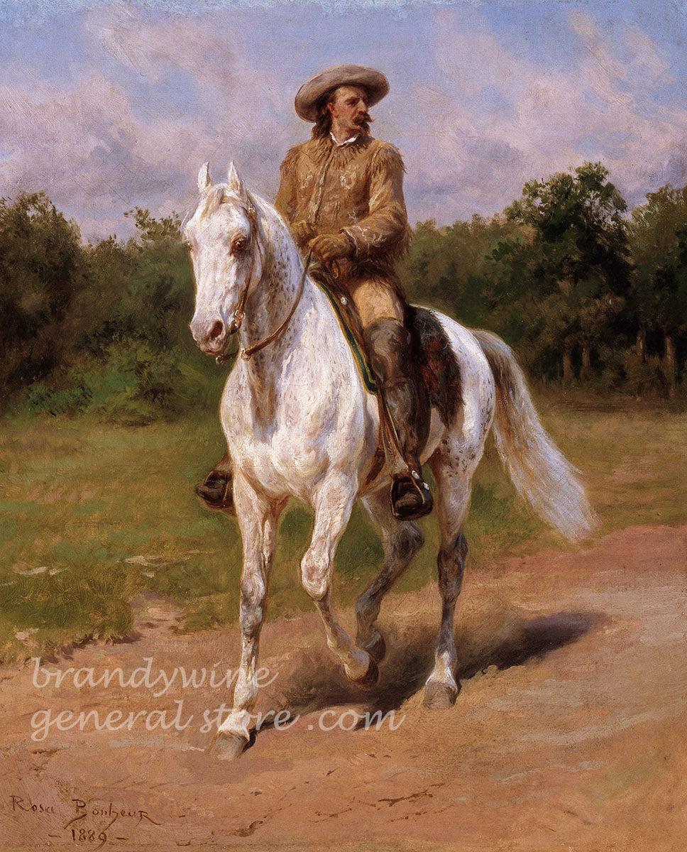 An archival art print of Portrait of Colonel William F. Cody painted by Rosa Bonheur in 1889. Europeans were completely enamored of William F. “Buffalo Bill” Cody’s Wild West show. When Cody, the performers and Native Americans traveled to Paris in 1889 to put on a show, French painter Rosa Bonheur visited the grounds of the encampment to sketch the exotic American animals and the Indian warriors with their families. Cody, in turn, accepted the invitation of Rosa Bonheur to visit her chateau in Fontainebleau where she painted this portrait. The painting is now housed at the Buffalo Bill historical center in Cody Wyoming.