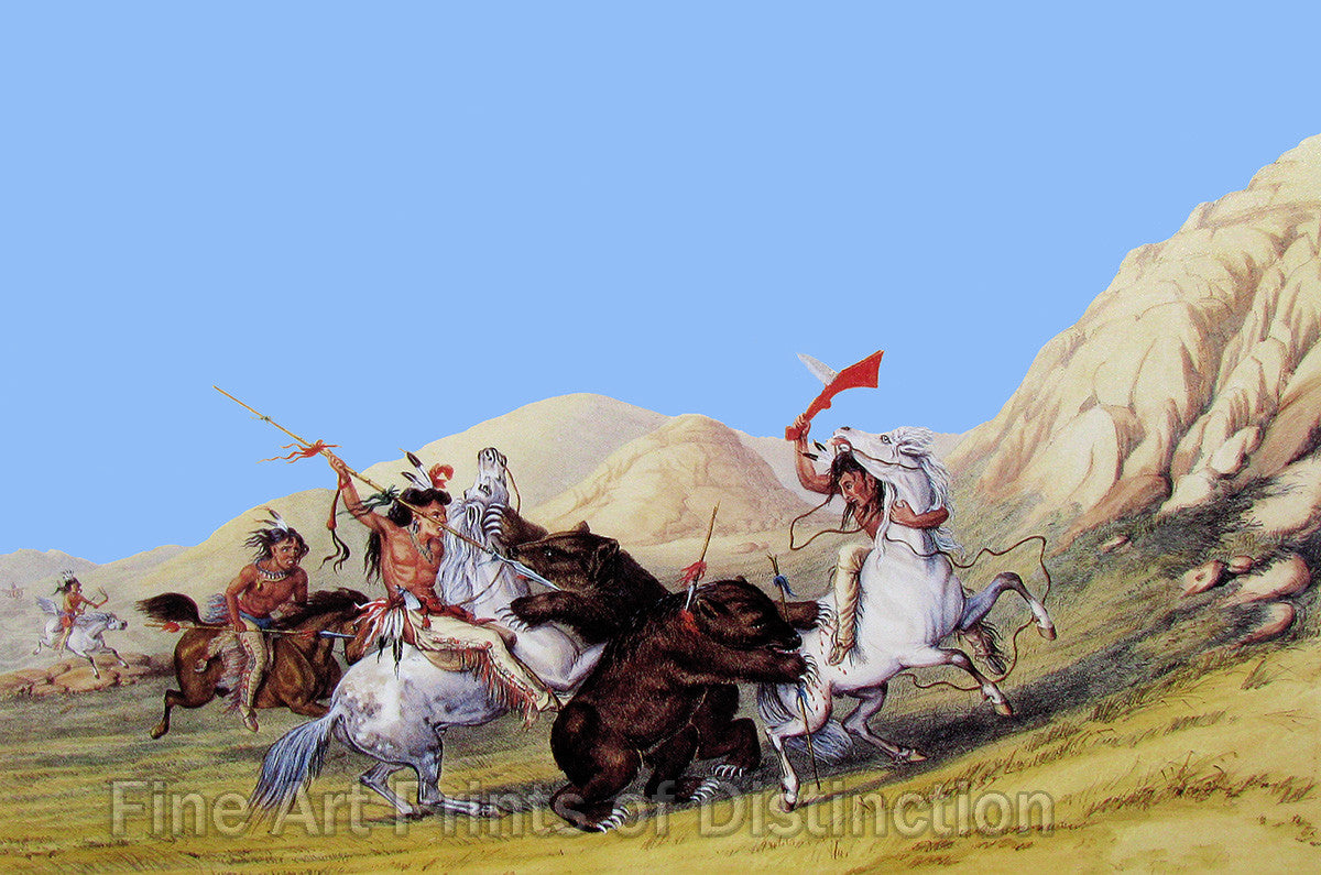 An archival premium Quality art Print of Attacking the Grizzly Bear by George Catlin for sale by Brandywine General Store. This painting was completed by the artist in the year 1844 and captures the primitive violence of a struggle between the Grizzly Bears and the Indians of the Plains. This hand colored lithograph was from the book North American Indian Portfolio - Hunting Scenes and Amusements of the Rocky Mountains and Prairies of America. This book and the illustrations by Catlin filled a need for the growing want of the American Public for all things Western and Indian related. The scene shows a group of four Indians on horseback that are being attacked by two large Grizzly Bears. The bears are tearing into the horses with one already being hit by the lances or spears of the Indians. One Indian has a homemade tomahawk that looks like he used the butt of a rifle and put a knife blade in the center, he is getting ready to drive this into the bear also. A great colorful print of the Wild American West. Please be aware that we have greatly changed this print, the original has a white sky that has really yellowed over the years and did not look very good. We turned the sky blue and made it, in our opinion, look better, however it does not look like the original artwork. Country Decor art print #130