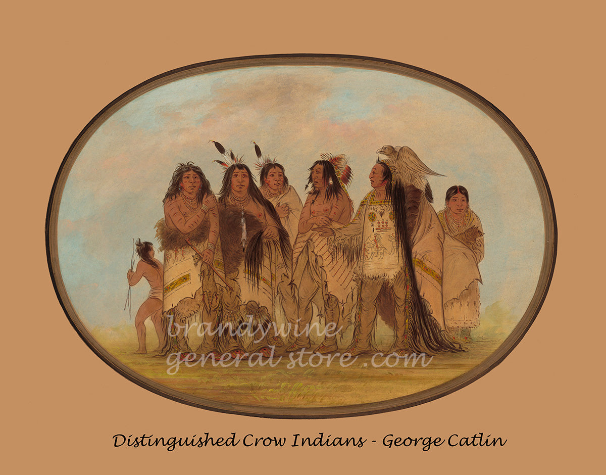 An archival poster of Distinguished Crow Indians painted by George Catlin in the 1860s. Luckily, the artist had notes describing and naming the Native Americans in a lot of his portraits from the old wild west. This one was labeled as follows: