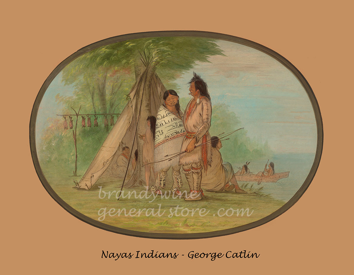 An archival poster of Nayas Indians painted by American West artist George Catlin in the 1860s. When Catlin exhibited these Native American paintings in New York in 1871 he published a catalog listing of all the works that were exhibited. Nayas Indians was described thus: